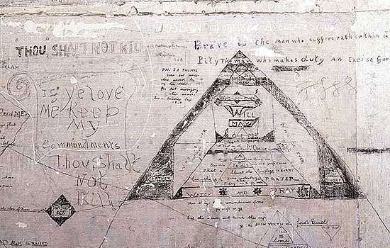 Bert was served his enlistment papers shortly after conscription was introduced, but applied for exemption on the grounds of his conscience. His conviction that ‘thou shalt not kill’ led him from a local tribunal at Pontefract to the Richmond cell block, to court martial in France, to hard labour outside Aberdeen and to long periods of solitary confinement in civilian prisons across the country. It was while detained at Richmond for refusing to carry out military orders that Bert recorded at least five graffiti on his cell walls, including the likeness of Annie.