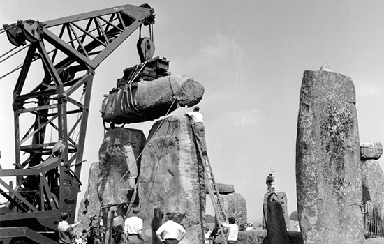 Meanwhile, the introduction of turnpike roads and the railway to Salisbury brought many more visitors to Stonehenge. From the 1880s, various stones had been propped up with timber poles, but concern for the safety of visitors grew when an outer sarsen upright and its lintel fell in 1900. The then owner, Sir Edmund Antrobus, with the help of the Society of Antiquaries, organised the re-erection of the leaning tallest trilithon in 1901.