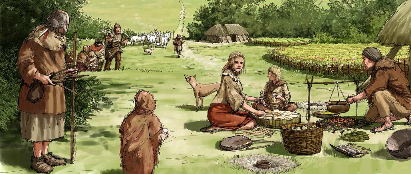 Domestic animals and plants were first brought to the British Isles from the Continent in about 4000 BC, heralding the start of the Neolithic period. As well as keeping domesticated animals such as cattle, pigs and sheep, people were cultivating crops such as wheat and barley.
