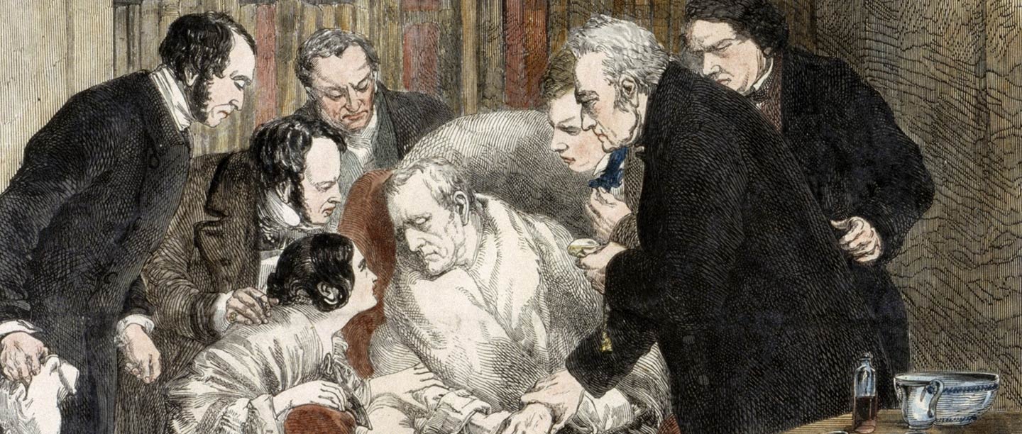 A hand-coloured engraving from the Illustrated London News, imagining the scene at Walmer as the Duke was dying, and showing who was present.