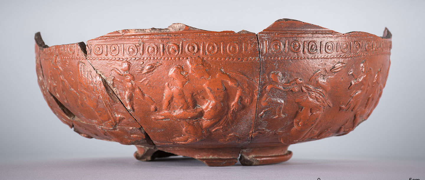 This bowl was made by the workshop of Libertus and Butrio in central Gaul – the best manufacturers working in this style at the time – and given its unusual subject, it may have been made to order.