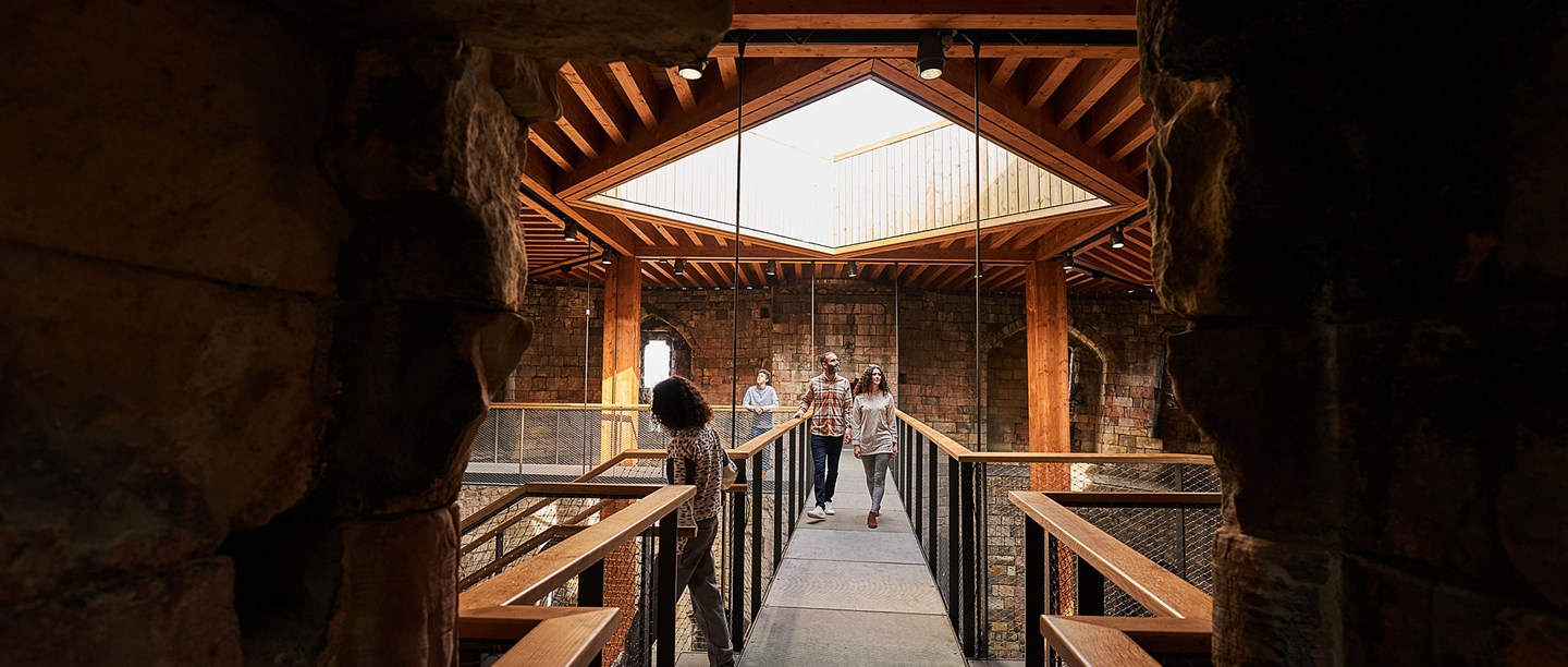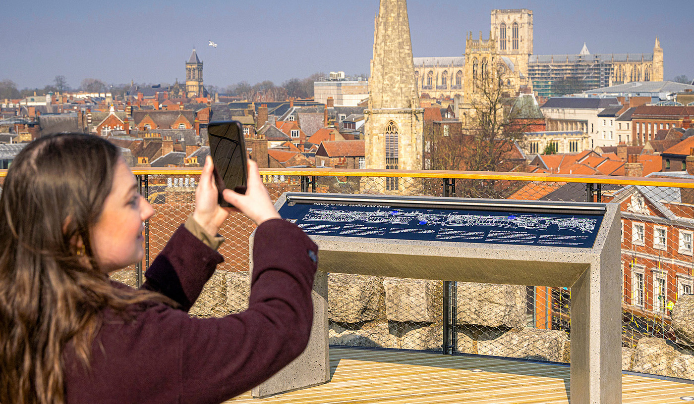 As part of the recent major conservation project at Clifford's Tower, an enormous structural timber frame has created the tower’s new roof deck. Fitted with timber benches, floor lights and a surrounding safety rail, you can enjoy the space as a magnificent viewing platform.
