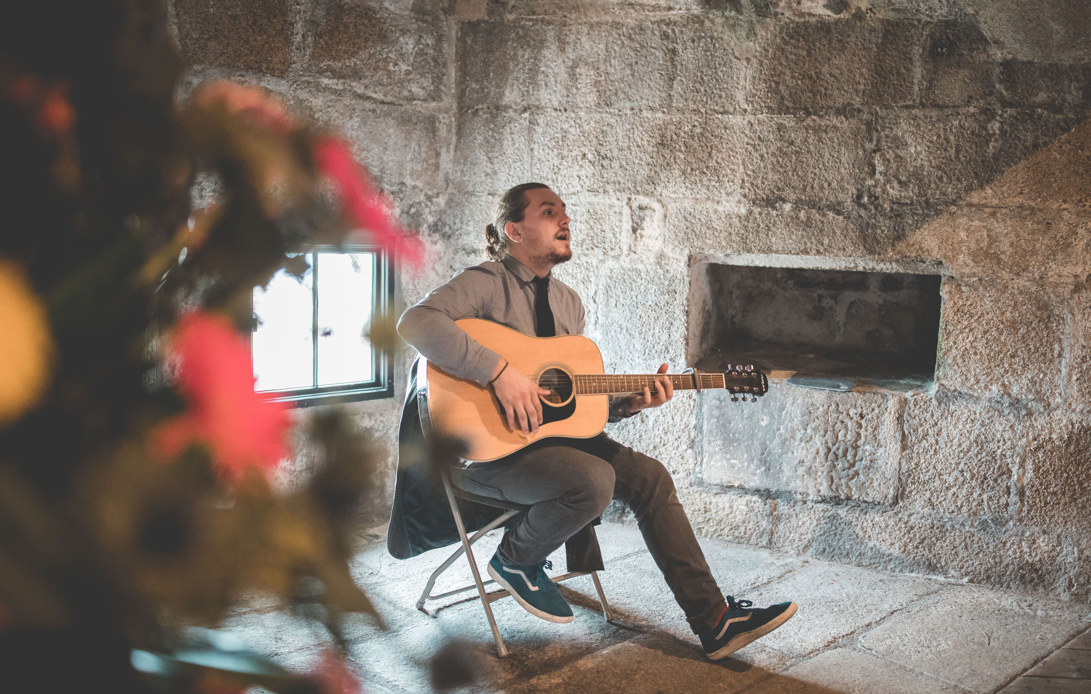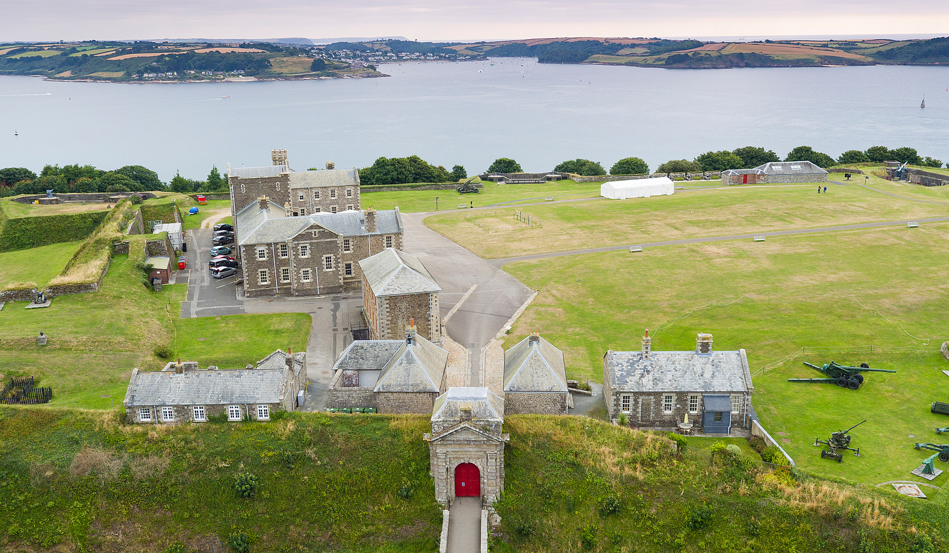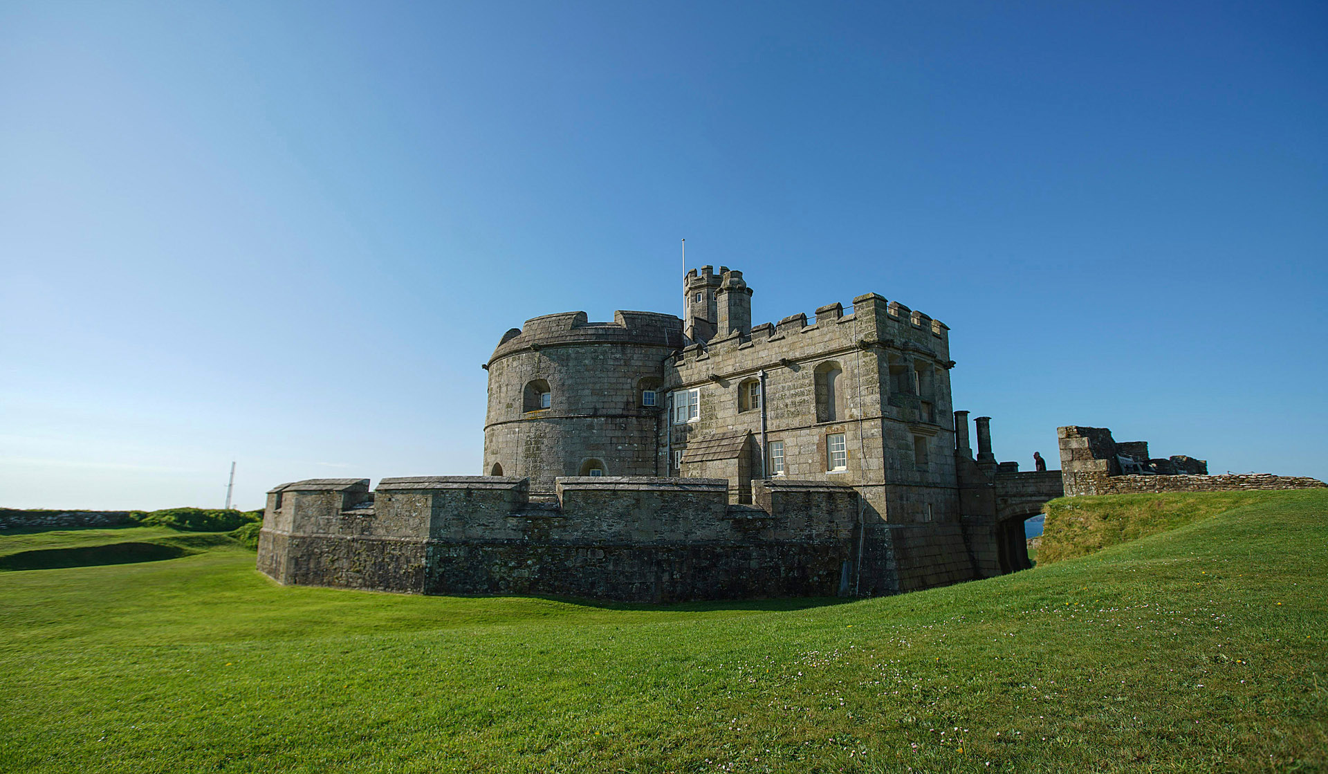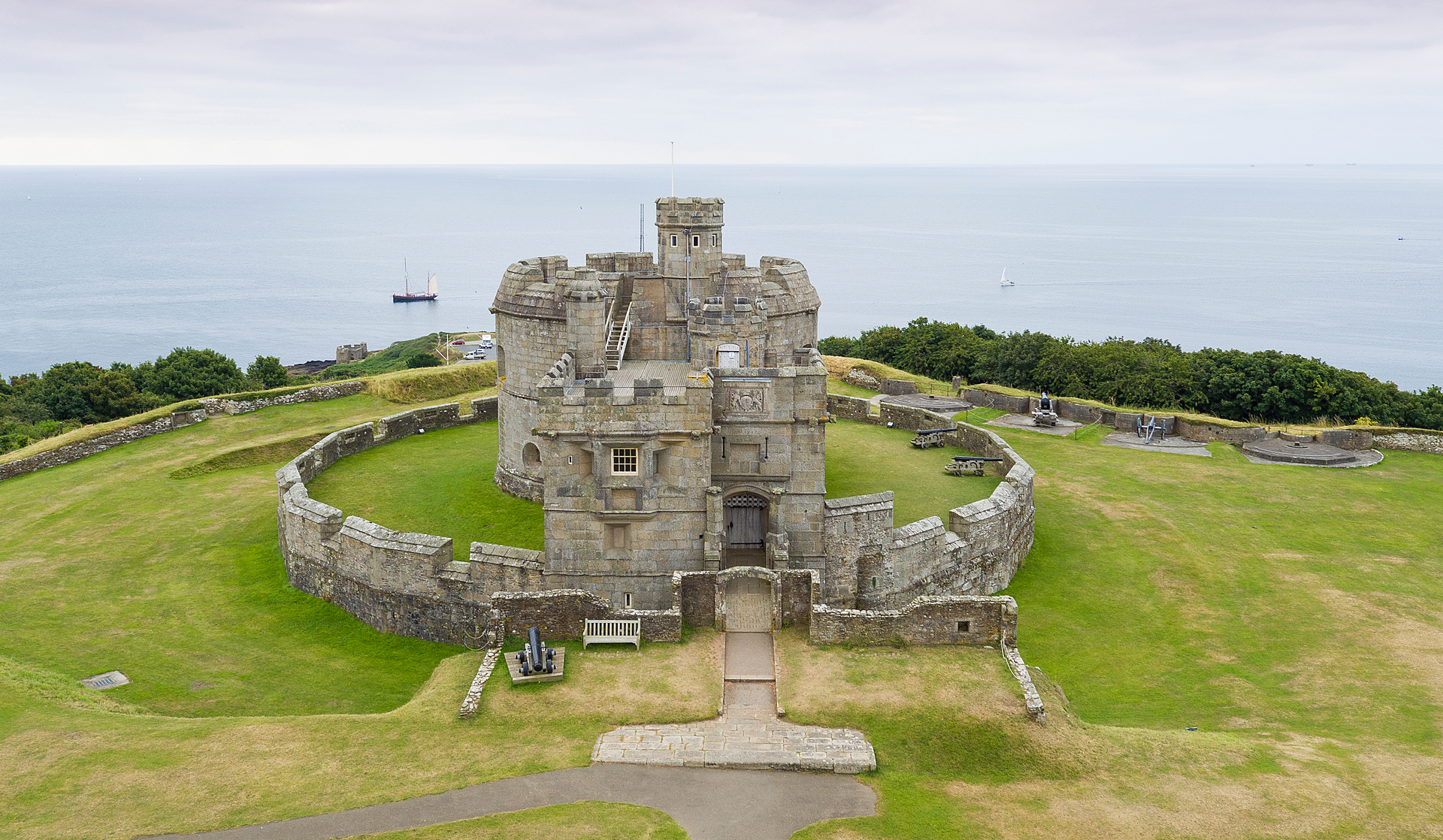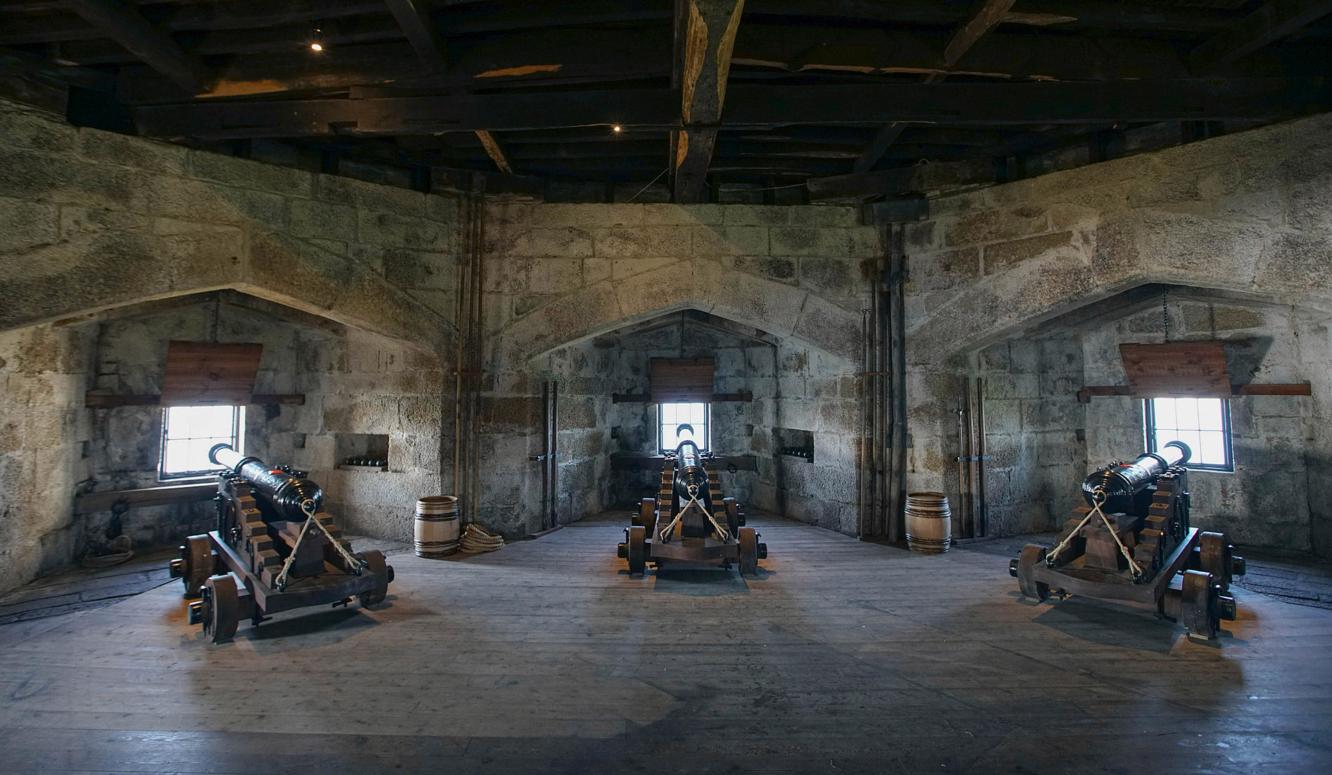 Crossing the stone bridge, enter the castle keep through a wonderful arched doorway with a heavy wooden door and portcullis, topped by the Tudor royal coat of arms. Inside, the unusual octagonal room with thick granite walls and wooden flooring makes an enchanting setting.