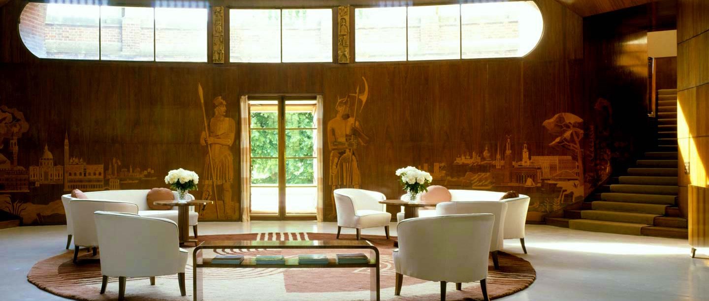 Separated from the main house only by a sliding Chinese lacquer screen the contrast between Art Deco and Medieval is stunning. The hall may be used for larger ceremonies, but more usually hosts dining and dancing - it looks wonderful with enhanced lighting. A minstrels' gallery may be used for live music performances. The room opens directly onto lawns, which parties can use in fine weather.